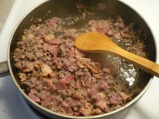 We just go ahead a buy pre-made pizza crusts from the store. We like this to be a nice and easy breakfast and there is a quite a bit on this pizza, so these seem to be able to stay nice and crisp. Preheat your oven to 350 degrees. First off fry up your sausage and bacon. We just put it all in a pan together.